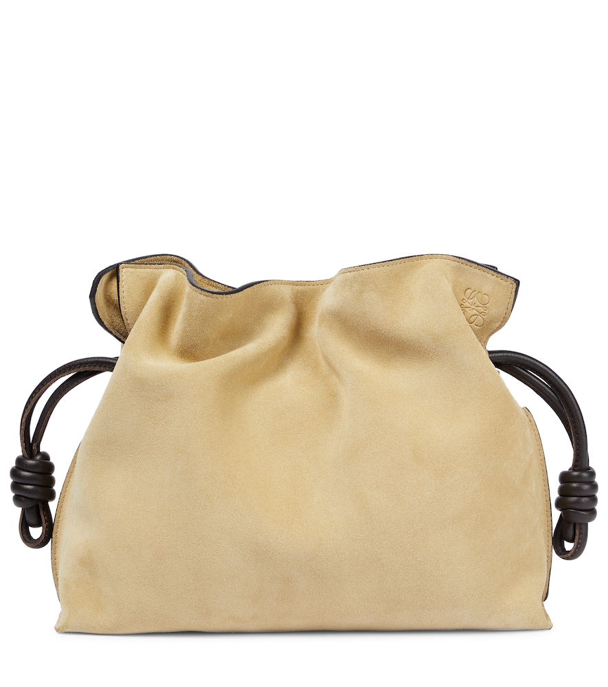LOEWE pays tribute to Iberian culture with the beige Flamenco clutch, which is crafted by hand in Spain using traditional techniques. Loewe Flamenco Small suede clutch
